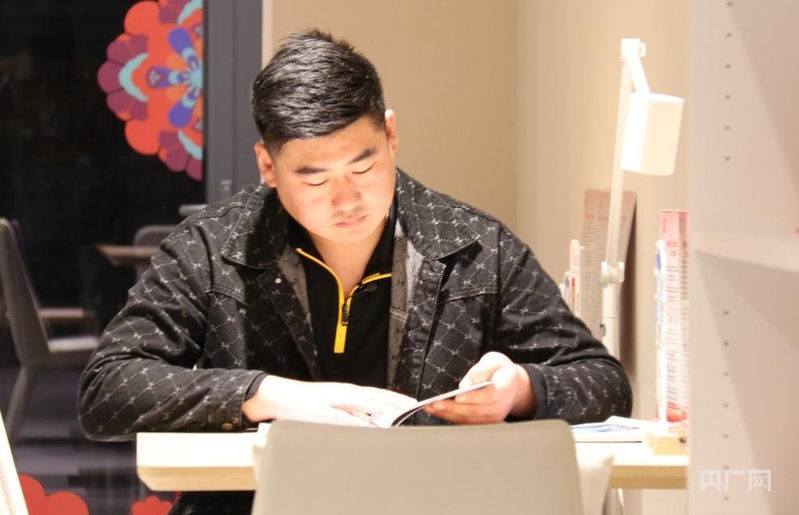 吴涛在共享图书馆看书(央广网记者 唐奇云 摄)